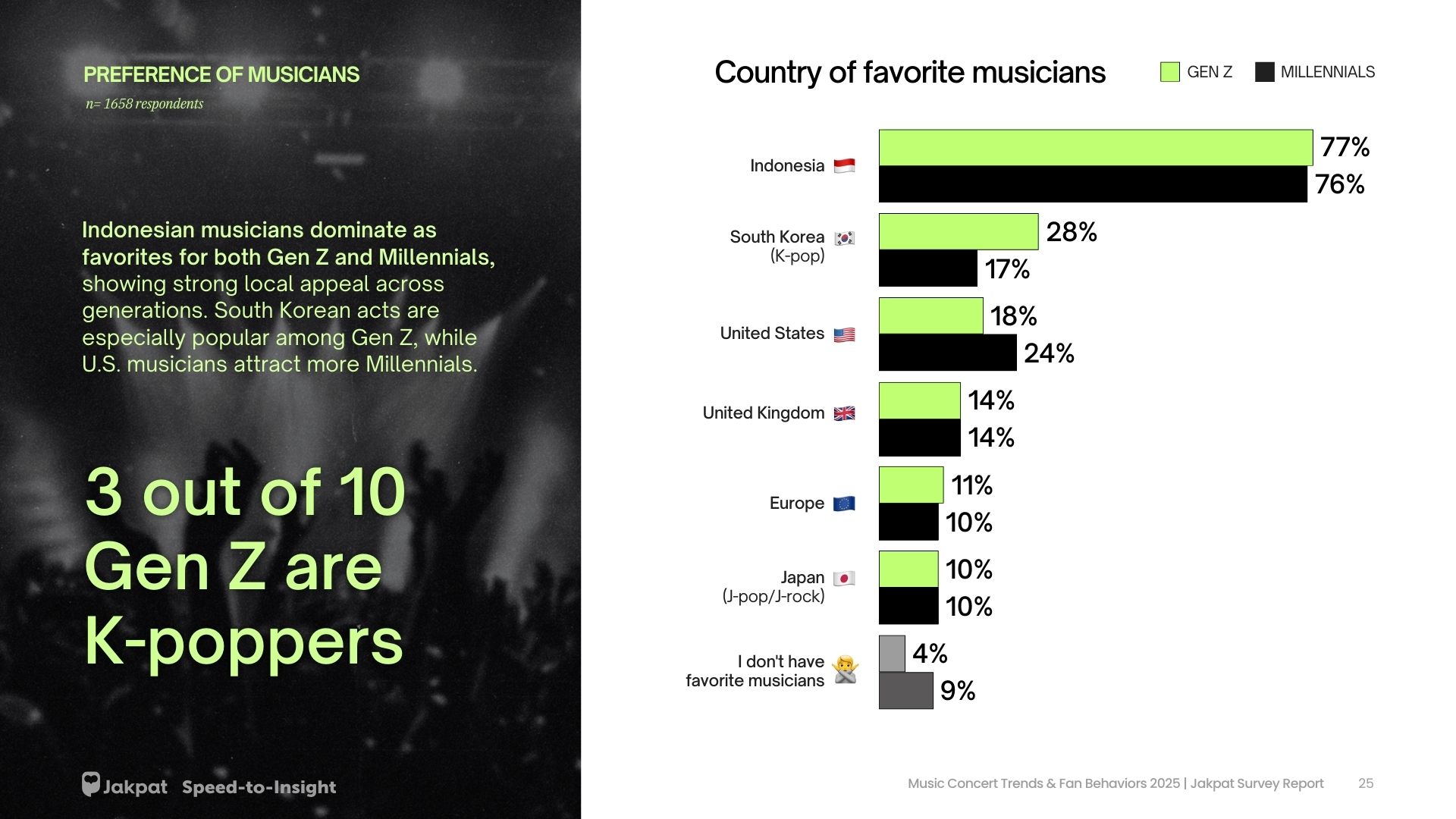 Selain itu, beberapa genre lain juga menempati posisi penting dalam preferensi pendengar. K-pop cukup dominan di Gen Z (35%) dibanding Milenial (26%), sedangkan rock justru lebih banyak diminati Milenial (31%) dibanding Gen Z (15%).