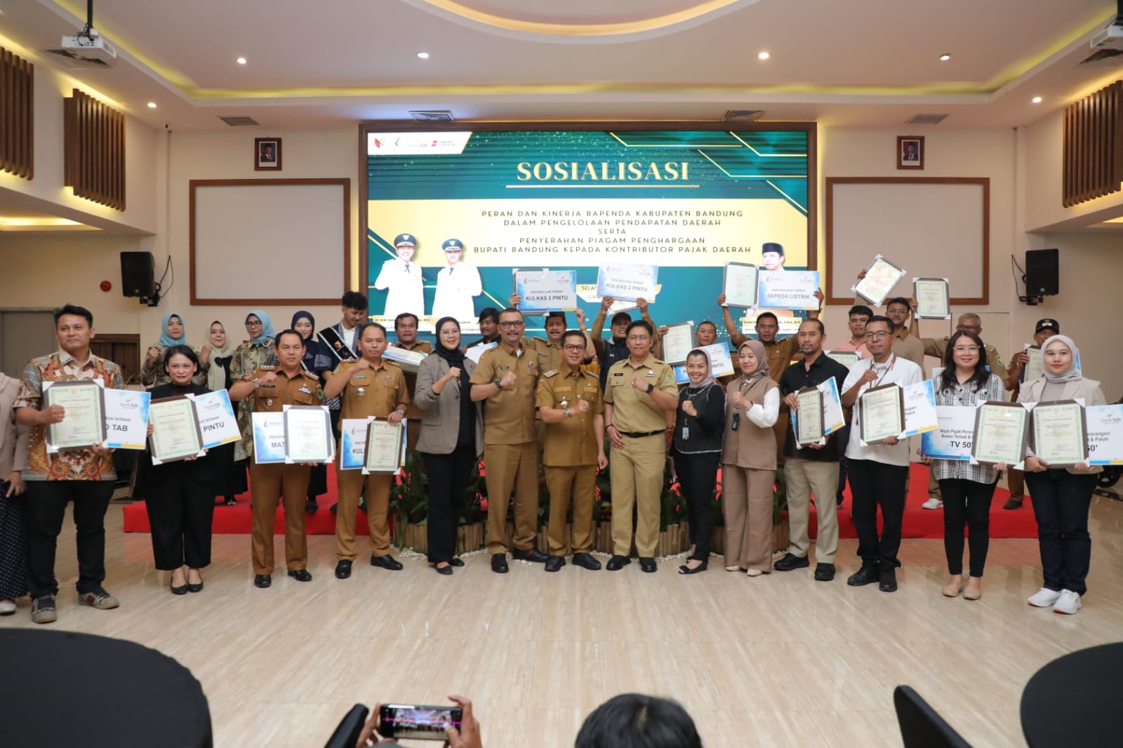 DARA| Badan Pendapatan Daerah (Bapenda) Kabupaten Bandung memberikan penghargaan kepada 19 kontributor pajak terbesar, dan PPAT (Pejabat Pembuat Akta Tanah) dan PPATS (Pejabat Pembuat Akta Tanah Sementara), BUMN, pihak swasta dan para kepala desa.
