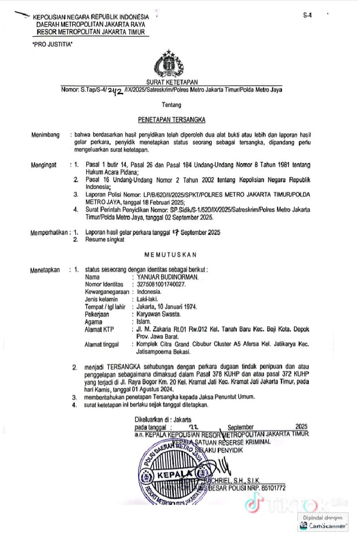 Penetapan tersangka berdasar Surat Ketetapan Nomor: S.Tap/S-4/242/IX/2025/Satreskrim/Polres Metro Jakarta Timur/Polda Metro Jaya yang beredar Jumat 3 Oktober 2025.