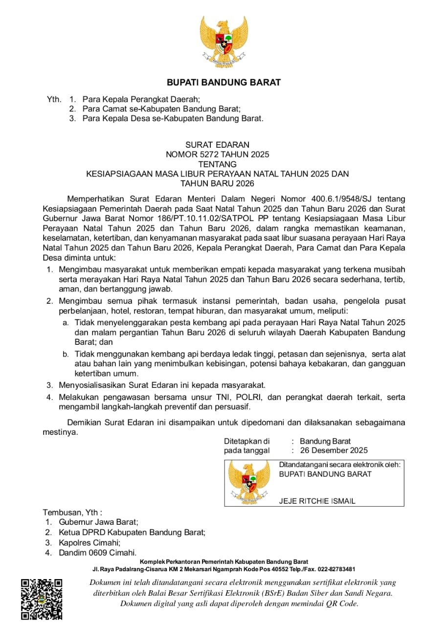 DARA| Bupati Bandung Barat Jeje Ritchie Ismail mengimbau kepada masyarakat di wilayahnya, untuk merayakan Natal 2025 dan Tahun Baru 2026 secara sederhana, tertib, aman, dan bertanggung jawab, serta menumbuhkan empati kepada warga yang tengah tertimpa musibah.