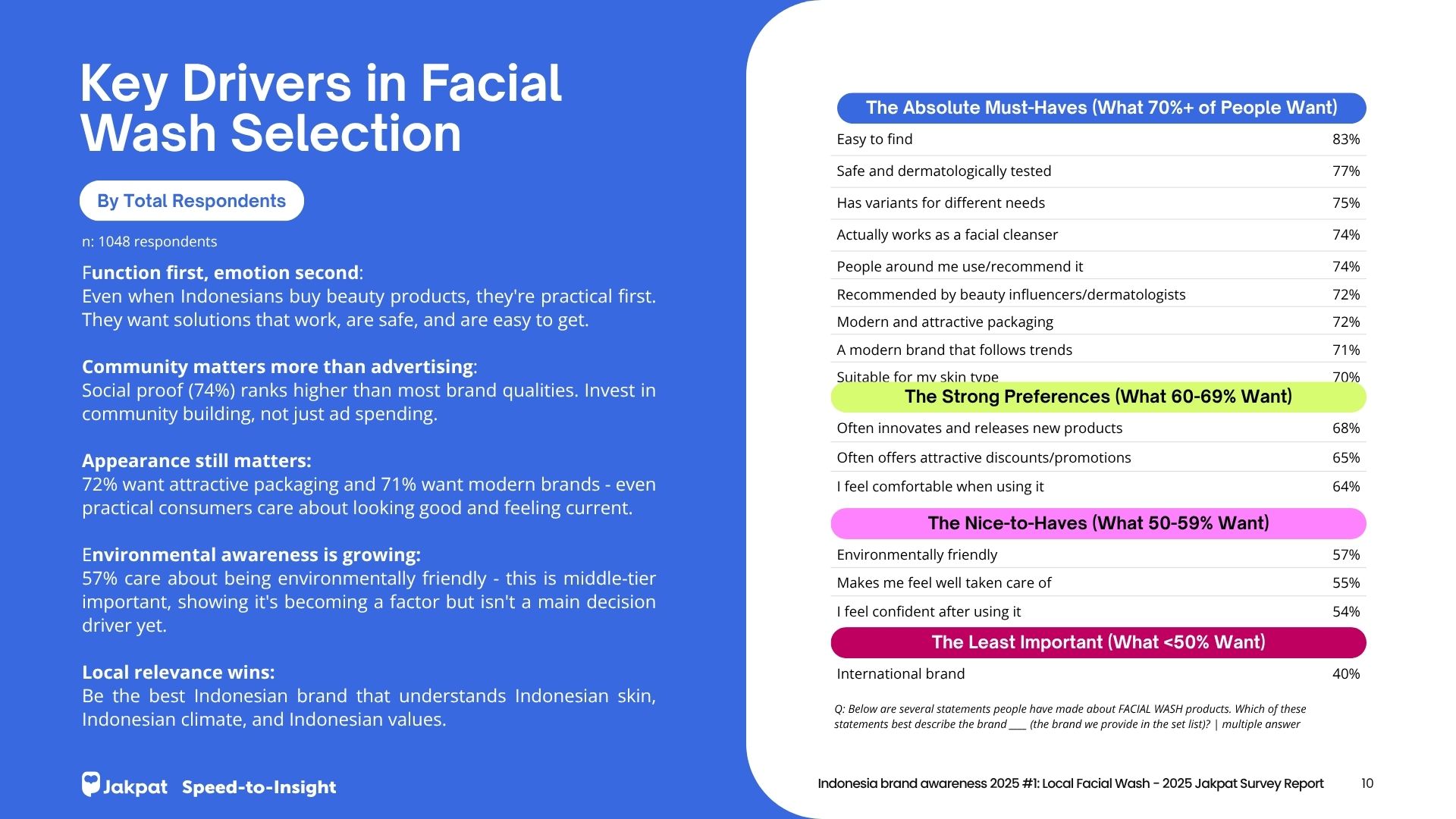 Survei terbaru yang melibatkan 1.048 responden Jakpat ini mengungkap sejumlah faktor utama yang memengaruhi konsumen dalam memilih produk facial wash lokal. Distribusi terbukti menjadi faktor paling penting, di mana 83% konsumen memprioritaskan kemudahan mendapatkan produk. Aman dan teruji secara dermatologis (77%) dan memiliki varian yang sesuai kebutuhan (75%) juga menjadi pertimbangan penting bagi responden.